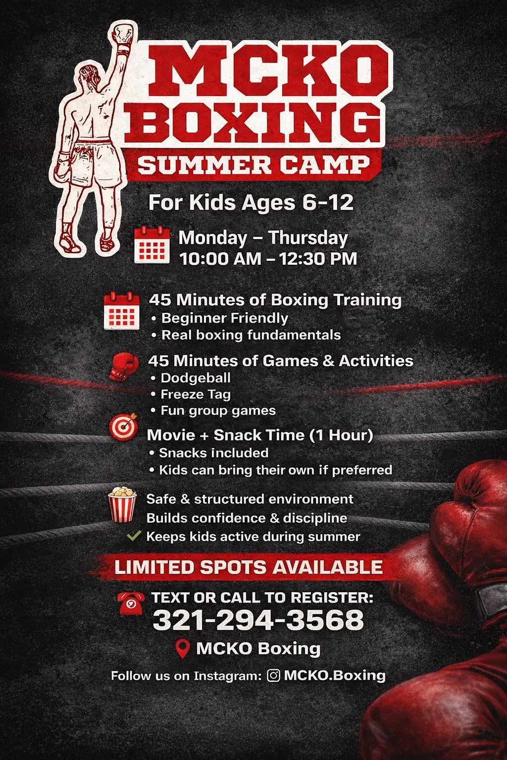 Four (4) Week Summer Camp at MCKO BOXING in Melbourne, FL. Monday-Thursday from 10am-12:30pm, ages 6 to 12.